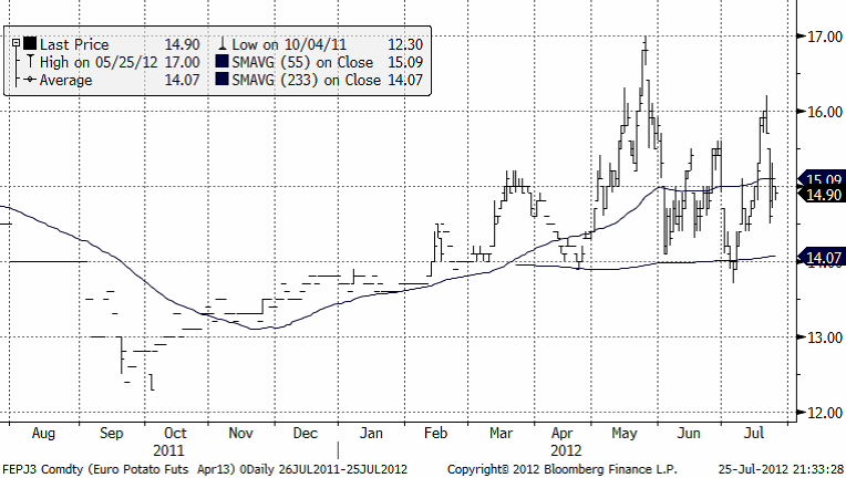 Potatispriset för leverans nästa år, har inte rört sig uppåt som spannmålen, utan rör sig sidledes i ett nu etablerat prisintervall mellan 14 och 16 euro per deciton. Prisintervall handlar man genom att försöka sälja i den övre delen av intervallet och försöka köpa i den nedre. Samtidigt är man vaksam på om priset rör sig utanför intervallet. Det brukar kunna vara en indikation på att priset ska röra sig ytterligare en bit åt samma håll.
