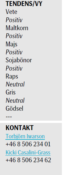 Vi fortsätter att ha en vy om högre priser på vete, maltkorn, majs, och sojabönor.