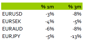Nedan ser vi eurons förändring mot fyra olika valutor, dels mot dollarn och dels mot starkare valutor.