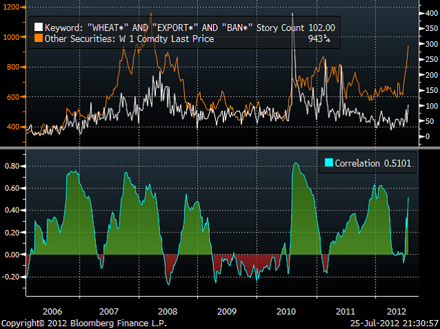 När priset är högt pga dåliga skördar finns alltid risken att politiker i olika producentländer inför exportbegränsningar, vilket förvärrar situationen på världsmarknaden. Rysslands jordbruksminister har hittills, senast förra veckan, sagt att Ryssland inte tänker införa exportbegränsningar, men med den torka som finns i fd Sovjetunionen, är det allt fler som tror att ett exportstopp kan komma. Vi kan se att ”snacket” om exportstopp på global basis ökar genom att göra en nyckelordssökning i nyhetsartiklar på nätet. Nedan ser vi ett diagram (vit kurva) för antalet artiklar per vecka som innehåller samtliga ord ”Export” och ”Ban” och ”wheat”. Den senaste veckan var det 102 sådana artiklar. I diagrammet nedan ser vi också vetepriset i Chicago (röd kurva). I den nedre delen av diagrammet ser vi korrelationen mellan prisförändringen på vete och förändringen i antalet sådana nyhetsartiklar som innehåller wheat+export+ban.