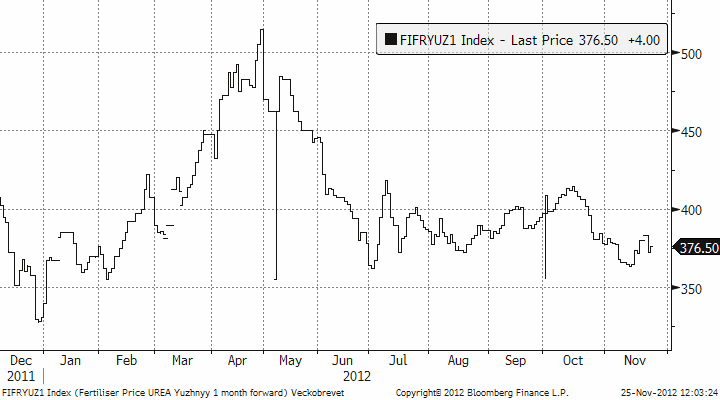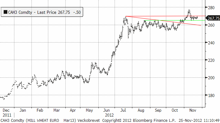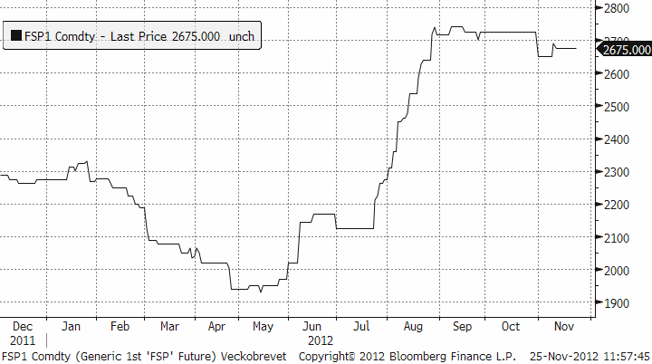De makroekonomiska problemen i Europa, som vi nämnde i förra brevet, blev ännu tydligare efter Moodys beslut att sänka Frankrikes rating från högsta betyg – vilket visar på den ökade oron för Eurozonens näst största ekonomi. Turerna kring utbetalningar till Grekland fortsätter då Eurozonens finansministrar återigen misslyckats med att komma överens, USA brottas med det finanspolitiska stupet (fiscal cliff) och spänningarna i Mellanöstern ökar. SEB fortsätter, att som första bank i världen, erbjuda sina kunder att prissäkra ett börsbaserat mjölkpris i kronor per kilo, i poster om 10,000 kg.