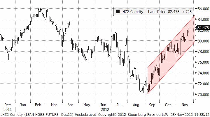 Grispriset (Dec 12) har fortsatt upp under den senaste veckan. Priset ligger på höga nivåer, nästan lika höga som i somras och uppgången bör ta slut på de här nivåerna. Gris terminer har en säsongs tendens att stiga efter Thanksgiving helgen, men den trenden borde vara begränsad nu i och med de redan höga nivåerna.