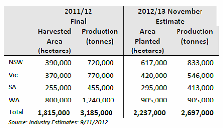 AOF (Australian Oilseeds Federation) säger att utsikterna är goda för ytterligare en stor canola skörd under 2012 nu när skörden drar igång, och uppskattar produktionen av canola 2012/13 till 2.697 mt, jämfört med 3.185 mt 2011/12. Men med en prognos på nästan 2.7 mt så kommer det att bli den näst största rapsskörden, endast överträffad av skörden året innan. Storleken på skörden kommer att påverkas mer av hektar än avkastning, som förväntas uppgå till 2.37 miljoner hektar sådd areal, en ökning från det tidigare rekordet med 23%, medan avkastningen estimeras till ett genomsnitt på 1.2 t/ha – vilket är lägre än det femåriga genomsnittet på 1.5 t/ha.