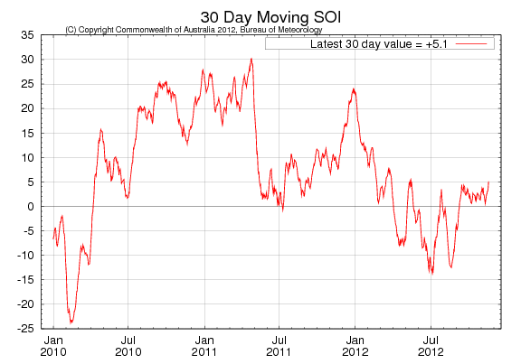 Även om temperaturerna i Stilla havet ligger under El Niño nivåer, så är de fortfarande över genomsnittet. Southern Oscillation Index (SOI) har hållit sig inom neutrala värden under de senaste två veckorna, och den senaste noteringen ligger nu på +5.1.