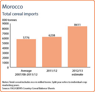 Spannmålsproduktionen i Marocko 2012 uppskattas till 5.3 mt av FAO, en minskning med 38% jämfört med förra årets exceptionella skörd och 23% under det femåriga genomsnittet. Sen sådd av grödor, köldperioder i början av året och därefter torka har bidragit till nedgången i produktionen. Produktionen av vete 2012 förväntas minska från 6.02 mt till 3.87 mt. Importen av spannmål förväntas därmed att öka med 35% under 2012/13 till rekordhöga 8.4 mt, varav 5.2 mt vete. Sådden av höstgrödor (framförallt vete och korn) pågår nu för fullt, och trots att ansenliga mängder nederbörd har saktat ned fältaktiviteten så har markfuktigheten förbättrats avsevärt och därmed gett möjlighet till en tidigare sådd.