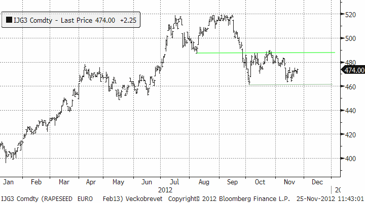 Rapspriset (februari 2013) handlas i ett brett intervall 460-490 och befinner sig i mitten. Marknaden strävar mot stödnivån och vi rekommenderar fortfarande en kort position. Får vi ett brott nedåt av 460- nivån, bör man sälja ännu mer.