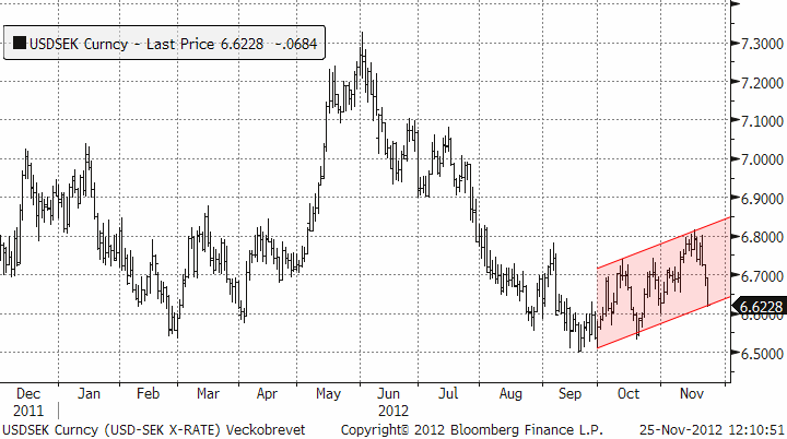 Genombrottet av USDSEK som vi skrev i förra veckan fick inte den väntade följdrörelsen. Kronan är stark och när dollarn försvagades i fredags blev fallet stort för usdsek. Stödet kommer nu in kring 6,60.
