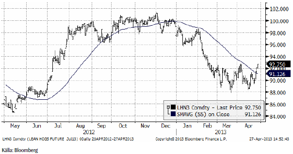 Sådden av majs i USA har inte kunnat ske på grund av den sena våren. Deadline, som anses vara den 10 maj närmar sig. Väderleksprognosen visar dock ett ”fönster” av gott väder, där sådden kan ske innan dess. De närmaste dagarnas väderutveckling kommer att ha ett avgörande inflytande över prisutvecklingen. Den kinesiska fågelinfluensan har sänkt konsumtionen av kyckling med upp till 80%. Det sänker efterfrågan på sojabönor i världen. Vi tror alltjämt på sjunkande priser på alla jordbruksprodukter. Grispriset i USA testar dock tekniska motståndsnivåer, möjligen just beroende på fågelinfluensan i Kina.