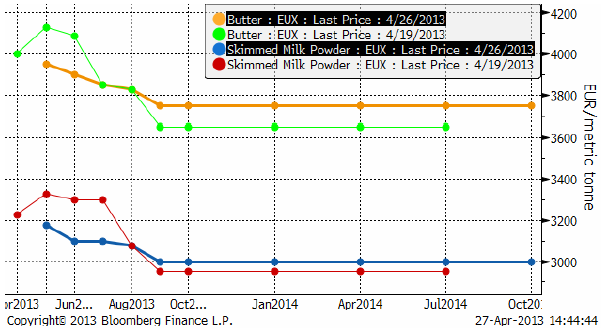 Nedan ser vi terminskurvorna för smör och skummjölkspulver på Eurex i fredags vid börsens stängning och veckan innan.