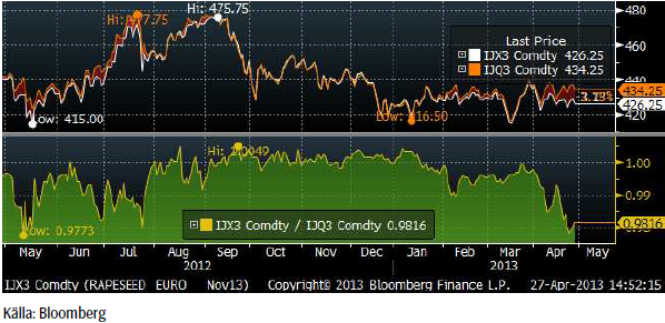 Rapspriset (november 2013) ligger kvar på någorlunda hög nivå. En anledning är att skörden i Europa väntas bli ca 1 månad senare än normalt.