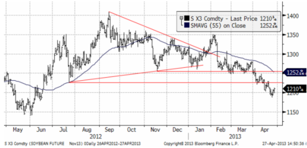 Sojabönorna (november 2013) ligger i en stadigt sjunkande pristrend. Amerikans sådd av soja har inte kommit igång alls. Förra året var 6% sått redan. Den kinesiska fågelinfluensan har ökat i nyhetsflödet och det fjäderfä i Kina är närmast osäljbart vad vi kan förstå från nyhetsrapporteringen.