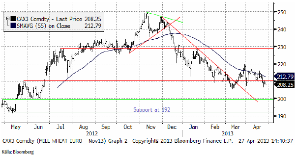 Priset på november (2013) har hållit sig över 210 euro, som nu återigen fungerar som ett tekniskt stöd. Frågan är om priset ska bryta uppåt och testa 230.