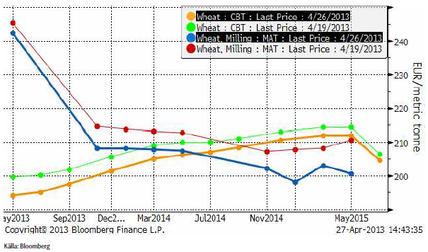 Ser vi på den senaste veckan förändring av terminskurvorna, ser vi att priserna gått ner både i Europa och i USA och ungefär lika mycket oavsett löptid, undantaget gammal skörd. Weetabix har slutat producera vissa frukostflingor i väntan på ny skörd. Det saknas helt enkelt brittiskt vete av gammal skörd.