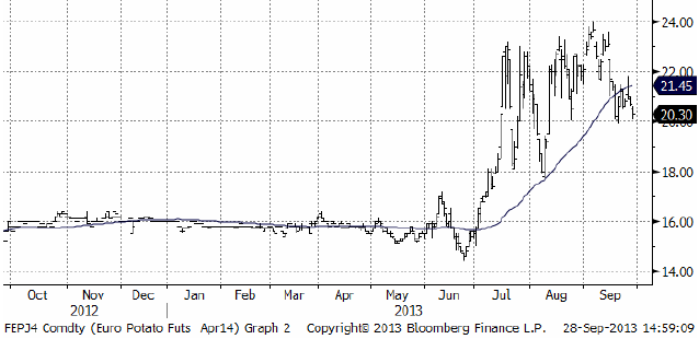 Potatispriset av årets skörd, som handlas i april-kontraktet på Eurex, har fortsatt varit volatilt i veckan. Efter en ganska stor prisuppgång, föll priset tillbaka och stängde veckan på 20.30 euro per deciton. Det finns intresse för nästa års skörd, som alltså handlas på april 2015-kontraktet, men handeln har ännu inte riktigt kommit igång.