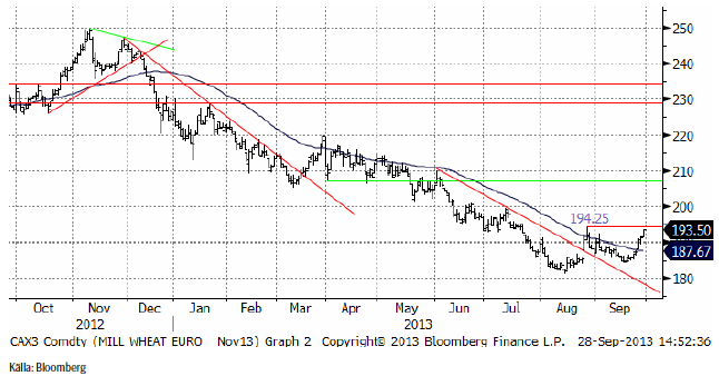 November månads terminskontrakt på Matif har arbetat sig upp mot motståndslinjen. Bryts den signaleras en stigande trend. Den fallande trenden är redan slut och vi har sedan mitten av augusti haft neutral rekommendation. Eftersom Chicagovetet har brutit motståndet redan (svagare dollar har inverkat), men är den viktigare börsen, går vi över till köprekommendation från och med det här veckobrevet. Vi skrev också förra veckan att förväntningarna på stigande pris helt saknas. Det finns alltså en god jordmån för stigande priser hos marknadens aktörer. De är av allt att döma tämligen oförberedda. Däremot tror vi inte just nu på att det finns stor potential på uppsidan, eftersom så många lantbrukare håller på sin spannmål och successivt kommer att sälja.