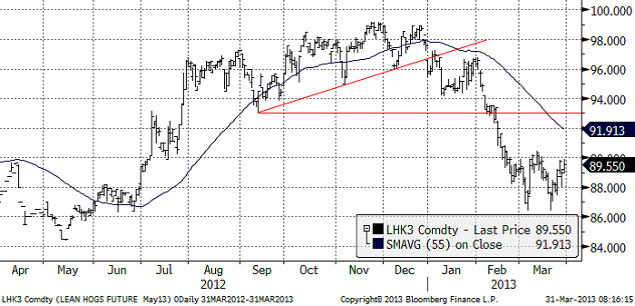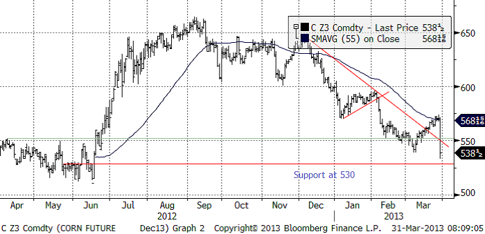 Majspriset (december 2013) föll kraftigt, som vi redan nämnt. Lagerrapporten var ultranegativ för majsen. Priset föll förbi botten från nedgången från december, men stängde pga limit-down stopp i handeln över stödet på 530 cent. Den nivån kommer naturligtvis att testas på måndag. På måndag är dessutom största tillåtna prisrörelse utökad eftersom torsdagen stängde limit down.