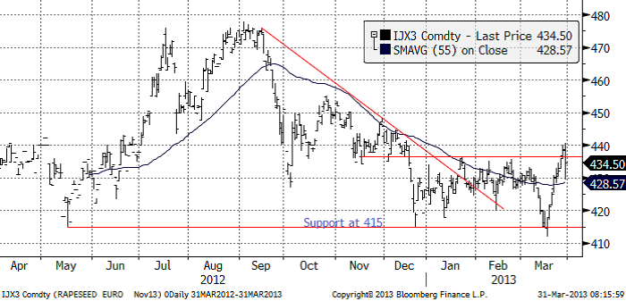 Rapspriset (november 2013) som gick upp och rörde vid 440 euro per ton, följde med sojabönorna ner. Nu kommer priset med största sannolikhet att ge tillbaka vinsterna till marknaden och falla ner mot stödet på 415 euro igen. Vi går nu åter till säljrekommendation på raps.