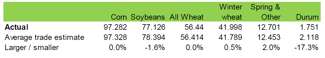 Lagren av vete, majs och sojabönor var per den 1 mars betydligt högre än vad marknaden förväntat sig, som vi ser i tabellen nedan.