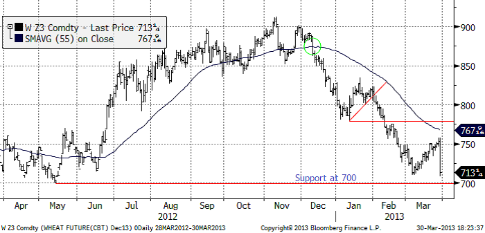 Decemberkontraktet på CBOT föll ner till botten på nedgången från december. Den nivån kommer säkert att testas på måndag och förmodligen brytas. 700 cent är en viktig nivå att hålla koll på. Bryts även den nivån, öppnas för ytterligare prisfall.