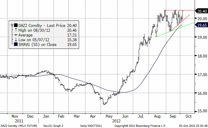 På den amerikanska börsen CME i Chicago testar priset på Klass 3 mjölk nu högstanoteringen. Ett brott uppåt öppnar för ytterligare uppgång, men den relativt kraftiga rekylen i september ger en varningssignal om att uppåttrenden är ifrågasatt av somliga på marknaden.