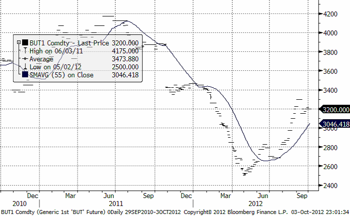 Vi skrev förra veckan om den tekniska säljsignalen som utlöstes när priset gick under bottennoteringen från början på augusti. Nu är dock priset nere på den nivå där marknaden uppehöll sig länge under maj och juni, vid 460 euro. Vi tror på ”sidledes” rörelse nu och att prisfallet alltså tar en paus.