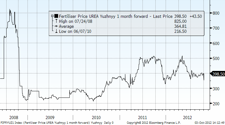 Veckan startade relativt starkt med Yuzhnyy mid-nivåer från 400 $/mt för oktober 12 upp mot 410 $/mt för Q1-13, Samma starka start gällde även för Egypt. Sedan dess har marknaden försvagats med lägre bid-nivåer och ni noterar att Yuzhnyy midpriser för 2012 nu ligger under 400 $/mt strecket. Egyptennoteringen å andra sidan har hållit sig stabil runt 460 $/mt. Urea NOLA håller sig relativt oförändrad och handlas i contango från 430 $/st för oktober upp till 455 $/st för Q1-13.