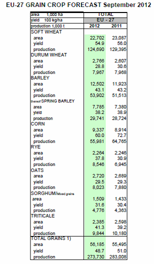 Cocerals senaste prognos visar på en nedjustering av vete 2012 till 124,69 mt mot tidigare estimat på 125.51 mt. Den totala produktionen av vete (inkl durum) uppskattas till 132.66 mt, vilket är i linje med USDA’s prognos. Även prognosen för majs och justeras ned till 55.98 mt (att jämföra med tidigare estimat på 65.73 mt) medan estimatet för korn justeras upp till 53.9 mt från tidigare 52.57 mt.