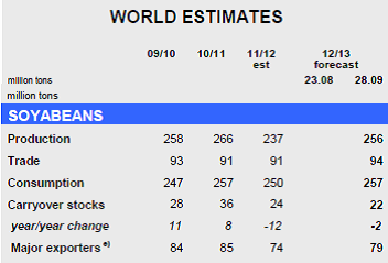 IGC skriver i sin senaste rapport att priset på sojabönor har sjunkit på månadsbasis som en följd av den pågående skörden och indikationer på en högre avkastning är förväntat. De justerar upp sin prognos för den globala produktionen av sojabönor 2012/13 med 8% till 256 mt, som en följd av en förväntad rekordskörd i Sydamerika där bl.a Brasilien kan komma att uppgå till 75-80 mt om vädret samarbetar.