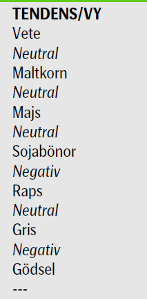 Marknaden tvärvände efter fredagens lagerstatistik från USDA. Som vi skrivit tidigare var den senaste WASDE-rapporten ganska ”skum” när det gällde lager i majs. Och det visade sig i lagerstatistiken att den var det. Köparna triumferade. Att marknaden tvärvände från negativ till positiv på så kort tid får vi ta som ett observandum. Möjligen finns nu ännu mer prisuppgång att vänta. För närvarande får vi lov att gå över till neutral rekommendation från negativ.