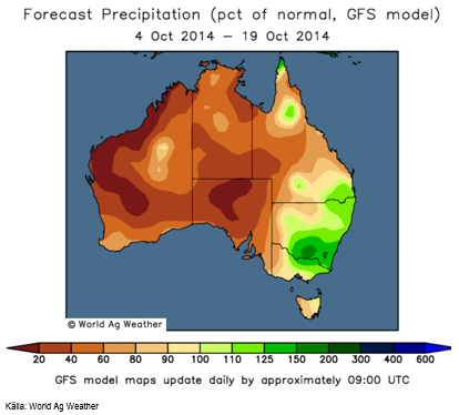 Australien väntas få mindre nederbörd än förväntat, utom just i SW, där odlingen av vete huvudsakligen sker.