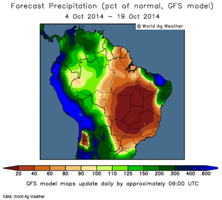 I Brasilien ser väderleksprognosen förskräckande torr ut. Stora och viktiga odlingsområden väntas få mindre än 20% av normal nederbörd de kommande två veckorna. Detta är en rejäl trendförändrare för soja, majs, socker och kanske kaffe.
