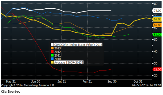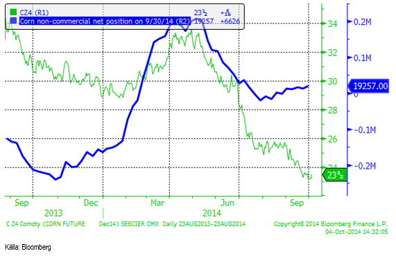 Vetepriset (novmeberterminen på Matif) har tagit sig upp från 150 euro nästan till 160. Där finns dock ett starkt motstånd och ur teknisk synvinkel skulle man kunna tänka sig en rekyl nedåt. Detta är dock ändå förmodligen en så låg nivå att det skulle kunna handla om de lägsta nivåerna för den här säsongen.