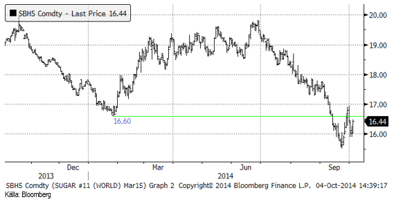 Torkan i Brasilien bör kunna ge stöd för sockerpriset. Tekniskt finns dock motstånd strax över dagens pris på 16.44 cent per pund.