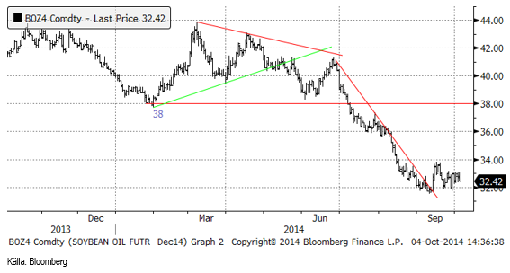 Sojaoljan har fallit i pris med ungefär 25% sedan i våras (för ny skörd). Den fallande pristrenden bröts för en månad sedan och sedan des har priset stabiliserat sig strax över 32 dollar och med ett tak på 34 dollar. Prisfallet lär ha kylt av all expansion av palmoljeoldling och därmed kan en rekyl uppåt i priset på vegetabilisk olja motiveras. För sojaolja är det i så fall till 36 eller kanske 38 dollar. På dessa nivåer finns starka motstånd, där 38 dollar är det starkare av de två.