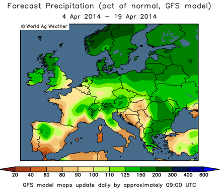 Indien är nästan helt torrt och väntas enligt GFS-modellen få endast 20% av normal nederbörd de kommande två veckorna. Kinas odlingsområden, dels i norra delen av landet och dels längs kusten söder om Shanghai, vara betydligt torrare än normalt de kommande två veckorna. Europa, inklusive Rysslands och Ukrainas jordbruksområden väntas få 125% – 200% av normal nederbörd. Frankrike och England torkar upp och får mindre nederbörd än väntat. Sverige, Danmark, Nordtyskland och Polen, som varit torrt, får å andra sidan mer nederbörd än normalt. Det har talats om att det är torrt i Polen, men detta repareras nu. Hittills är förutsättningarna fortsatt goda för att det ska bli en ovanligt riklig skörd i Europa.