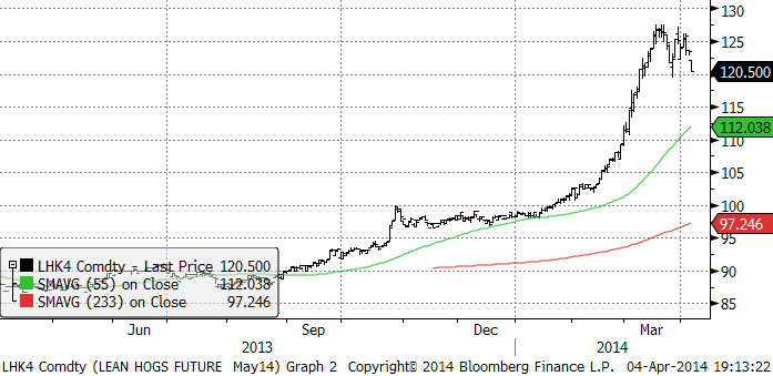 För två veckor sedan berättade vi att kulmen i PED-virusets spridning har passerats och att vi därför förmodligen sett toppen på prisuppgången på Lean Hogs på mellan 120 och 130 cent. Tekniskt ser priset ut att stå inför ett kraftigt och snabbt prisfall.