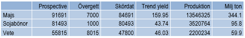Arealen av sojabönor ökar kraftigt och det var väntat. Lönsamheten är, som vi redovisat tidigare, generellt sett bättre med dagens prisbild, än den är för majs. Sådden av vete, som till största delen redan är känd sedan i höstas, blir som marknaden väntat sig och det är ingen stor förändring från förra året vad gäller arealen. Den stora överraskningen var att arealen av majs blir nästan 1.6 miljoner acres mindre än vad marknaden förväntat sig.