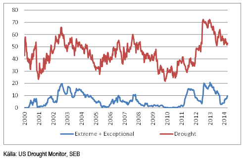 De tre största majsexportörerna i världen, USA, Brasilien och Ukraina kan tillsammans få 30 mt lägre produktion i år än vad man trodde för några månader sedan. Torkan i USA:s veteområden innebär att USA inte kommer att producera lika mycket vete som förra året. Däremot ser det riktigt bra ut i EU med dels stora arealer höstsådd vete och raps och dels mycket gynnsamt väder.