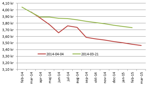 Nedan ser vi terminspriserna man får i svenska kronor från terminspriserna på SMP och smör på Eurex, omräknat till kronor per kilo mjölkråvara. Notera att hela den här prisnivån alltid ska ligga över avräkningspriset på mjölkråvara med ca 50 öre, som är en uppskattning av kostnaden för att förädla mjölkråvara till SMP och smör. Fram till och med oktober finns nu regelmässigt priser på Eurex. Därefter är det mina estimat om var jag tror en köpkurs är.