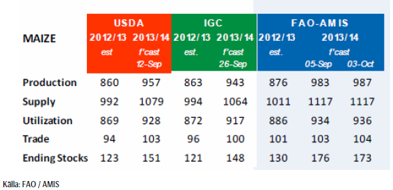 FAO / AMIS justerar upp sin prognos för den globala produktionen av majs till 987 mt från den tidigare prognosen på 983 mt, främst på grund av högre estimat för Kina, Indien och USA. Utgående lager beräknas öka med 33% från ingående lager, där en återhämtning av majs lagren i USA står för en stor del av denna förväntan.