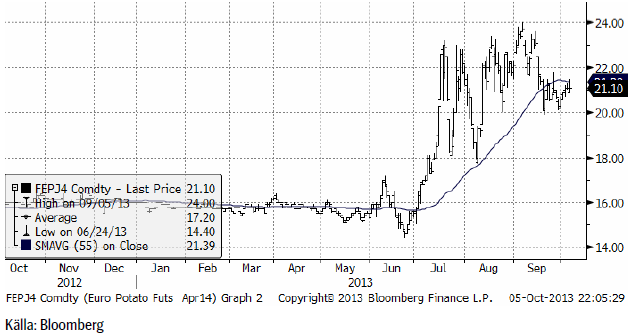 Potatispriset av årets skörd, som handlas i april-kontraktet på Eurex, har stigit lite till 21.10 euro per son, men det ser ut som om uppgången som började i juni och tog priset från 15 euro till 24 euro som högst har tappat fart.
