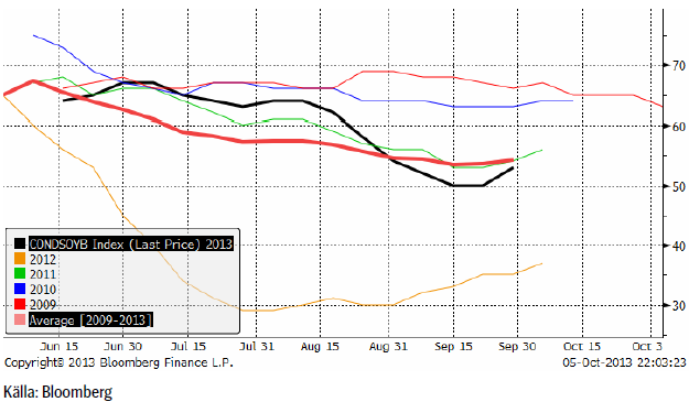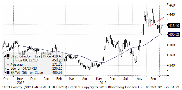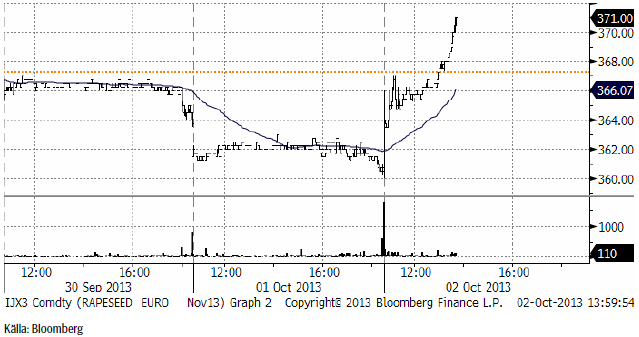 Rapspriset (november 2013) fann återigen stöd på 360 euro per ton. Hur detta skedde är intressant och vi återkommer till det nedan. Tekniskt kanske bilden håller på att ändra sig, men vi rekommenderar fortfarande att man är såld rapsfrö.