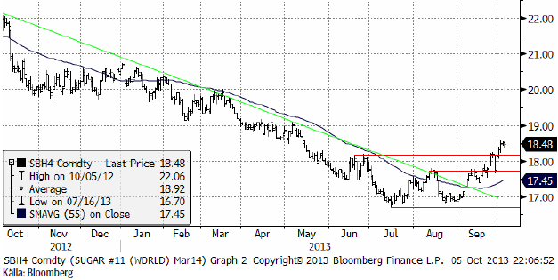Marskontraktet på råsocker har stigit med 10% i veckan som gick. Vi ser nu att den fallande trenden, som pågått sedan februari år 2013 nu är slut.