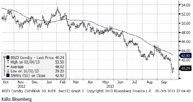 Och nedan ser vi den mycket baissigare utvecklingen på sojaoljan. Efter ett så kraftigt prisfall som vi hade förra veckan, är det inte ovanligt med en rekyl uppåt – en sådan är dock i regel ett säljtillfälle.