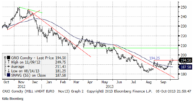November månads terminskontrakt på Matif studsade först mot motståndet på 194.25, men tog sedan ny fart och bröt igenom. Vi har nu en teknisk köpsignal och trendvändning uppåt även i Matif-vetet. Förra veckan gick vi som bekant över till köprekommendation på spannmål.