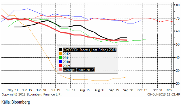 Överlag är utsikterna för grödorna goda. I USA klassas strax över hälften av grödorna som ”good/excellent, och trots torrt och varmt väder under sensommaren. En rekordproduktion förväntas, till stor del på grund av utökad areal vilken kompenserar för en något lägre avkastning. Även i Kanada och EU är prognoserna gynnsamma, med undantag av bl.a norra Italien och delar av Balkan där sen sådd och varma temperaturer påverkat grödorna negativt. Även i övriga delar världen, såsom Ryssland, Kina, Ukraina och Brasilien är utsikterna goda.