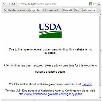 Efter att USA:s federala budget överskridits av Obama-administrationen, är nu ”non-essential”, dvs oviktiga, myndigheter stängda. Dit hör USDA och går man in på deras hemsida för att söka såväl ny som gammal information, möts man av nedanstående webbsida: