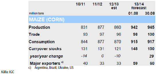 IGC (International Grains Council) kom med sin rapport i förra veckan och har ökat sitt estimat för den globala spannmålsproduktionen 2013/14 med 9 mt till 1929 mt. Stora skördar av bl.a vete och majs bidrar till en förväntad ökning med 8% på årsbasis från 2012 års produktion då torka drabbade stor del av grödorna. Utgående lager förväntas öka med 37 mt på årsbasis till 365 mt, vilket framförallt återspeglar högre utgående lager för majs (+29 mt y/y).