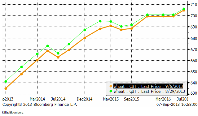 Nedan ser vi terminskurvorna för Chicagovete. Det är den enda marknad som det är intressant att sälja långa terminer på, eftersom det är contango och nästan alltid är det.