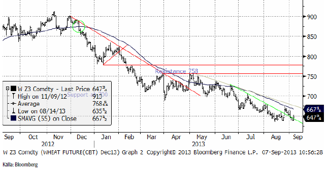 Vetemarknaden ligger och driver i nyhetsmässig stiltje. Majs- och i synnerhet sojamarknaden håller på att lämna ett år med låga lager och gå över till ett år med väsentligt högre produktion. Ännu finns dock inga riktigt tillförlitliga estimat på skördens storlek i USA och hur torkan i augusti har påverkat den.